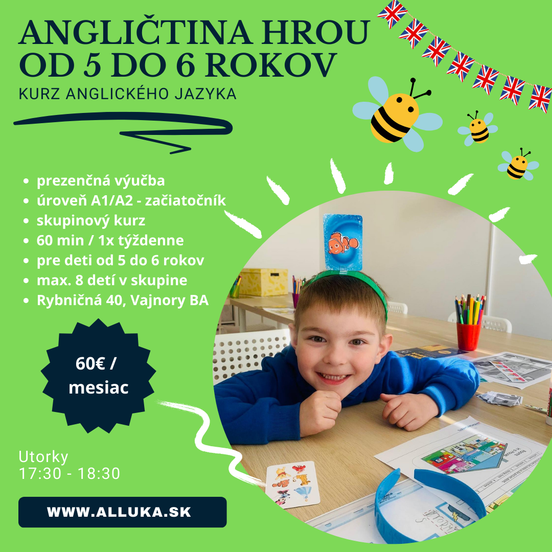Jazykovu skolu Alluka vo Vajnoroch velmi odporucam. Vidno, ze ich to bavi a ucenie je pre nich poslanim. Syn chodi na anglictinu pol roka, hned si oblubil lektorku Katku, na kazdu hodinu sa tesi a vidime na nom pokroky. Je to pre neho zabava ale zaroven sa aj realne nieco nauci. Robia aj rozne akcie … celá recenzia na Halloween, Vianoce atd. kedy prichystaju pre deti zaujimave poobedia plne anglictiny a hier. Taktiez sa tesime na letny tabor. Za nas skvela volba, odporucam kazdemu. Dakujeme :)